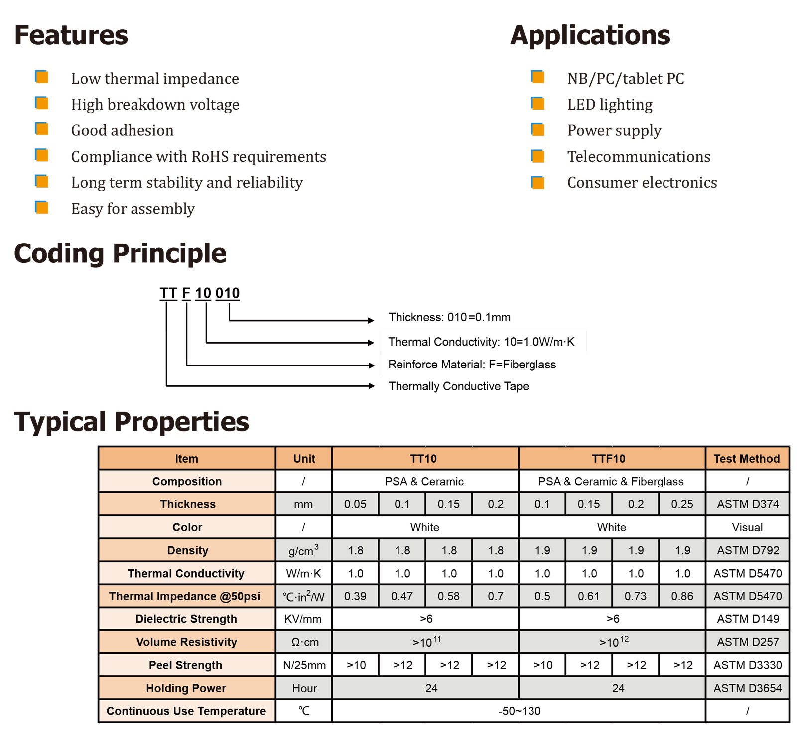 TT系列導熱膠帶是一種用高導熱陶瓷填料填充的丙烯酸類壓敏膠。TT系列由于其良好的導熱性,改善了發熱元件和散熱器之間的熱傳導。具有優異的粘合性能和較低的耐熱性,可以取代熱油脂和機械固定方法。